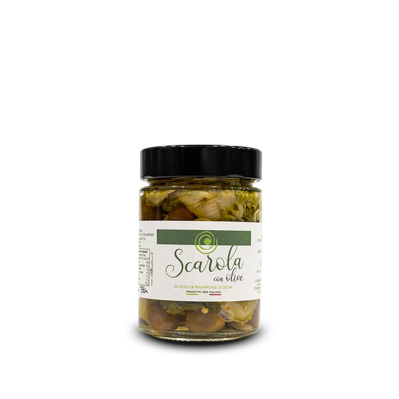 Das Gemüse der Marke Oliocentrica in nativem Olivenöl extra stammt aus der pontinischen Landschaft und bringt den Reichtum der kulinarischen Traditionen mit sich. Die Eskariol hat knackige, glatte Blätter und einen weniger bitteren Geschmack als andere Endiviensorten; Zusammen mit Oliven ist es eine hervorragende Füllung für die berühmte Tiella di Gaeta.